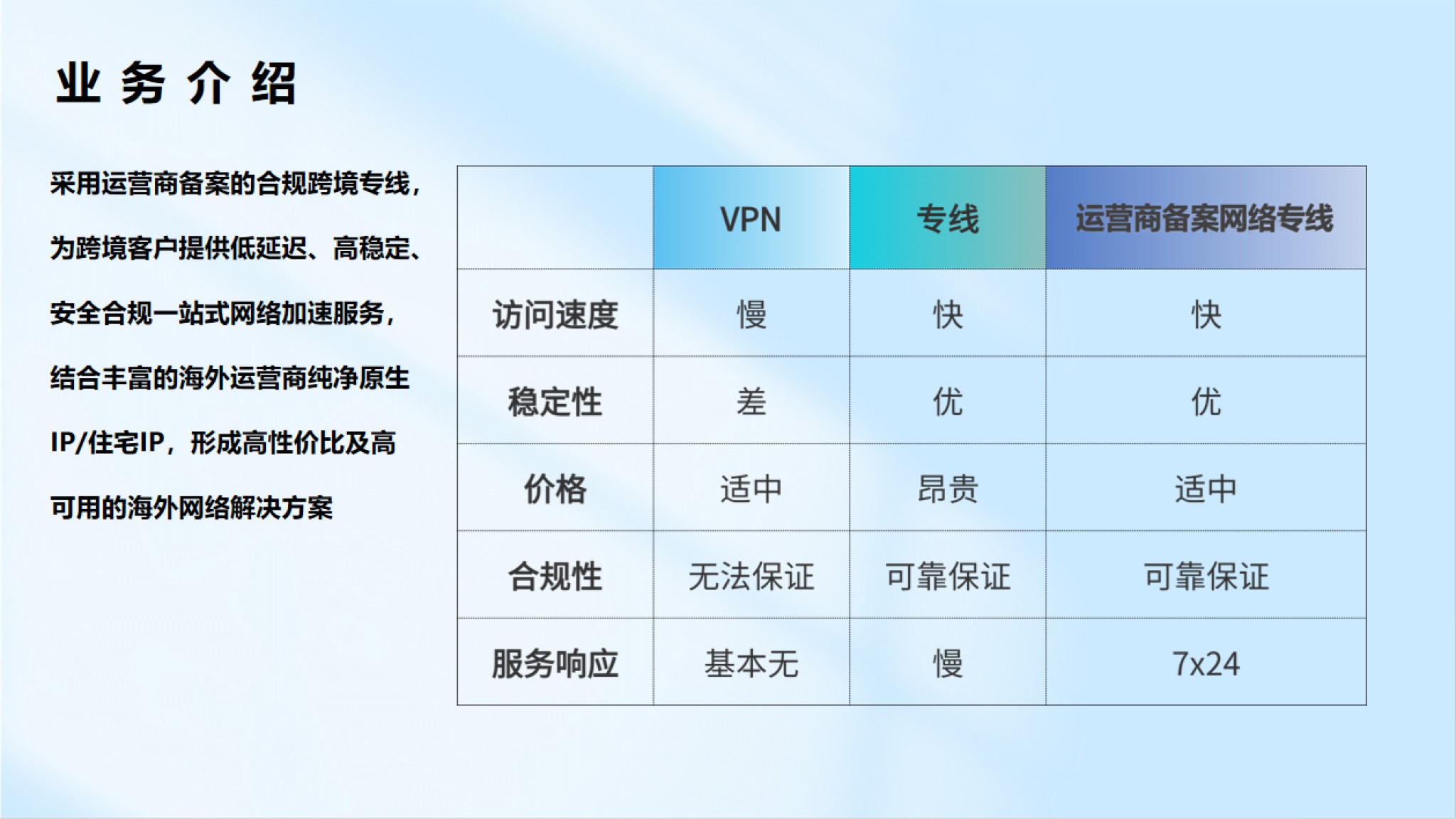 從線路申請、路由優(yōu)化到維護(hù),提供一站式專業(yè)服務(wù),一對一解決問題,專業(yè)營銷團(tuán)隊(duì)一對一定制服務(wù)